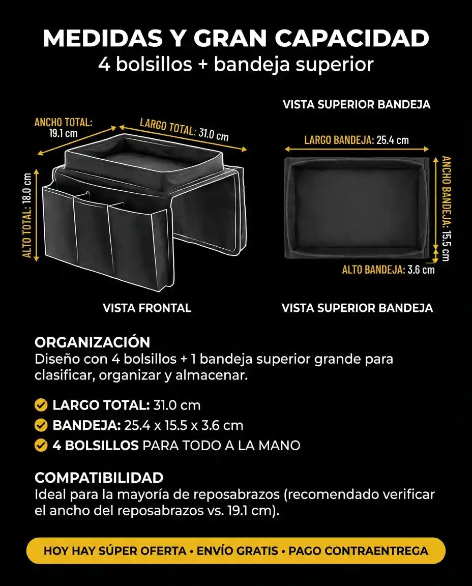 Tiene gran capacidad (31.0 x 19.1 x 18.0 cm), con 4 bolsillos para control, celular, gafas, cargador, etc., y una bandeja superior grande (25.4 x 15.5 x 3.6 cm) para apoyar lo esencial.